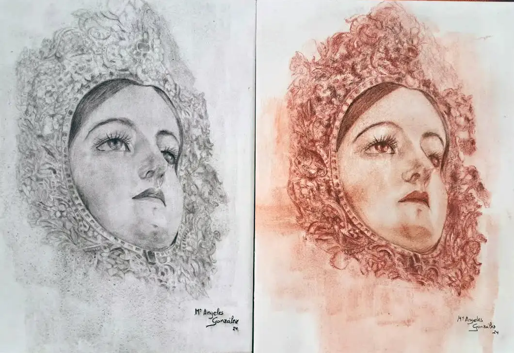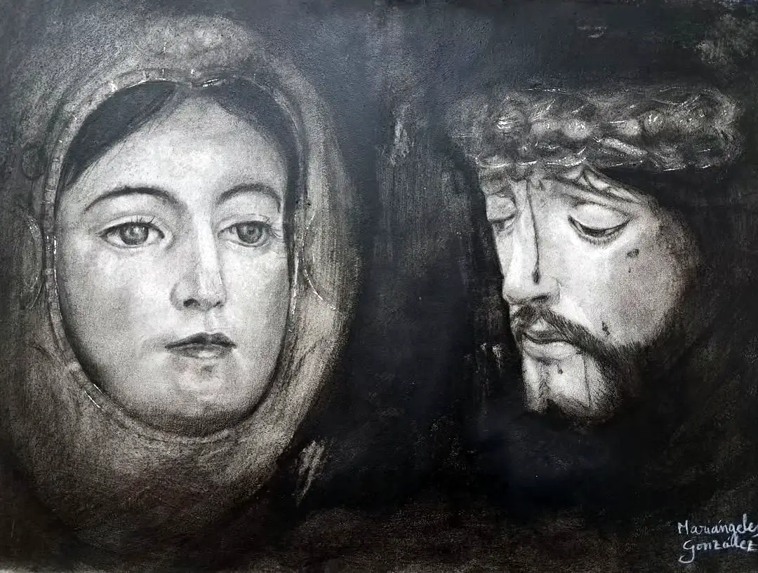 Virgen de Araceli y Nazareno. Grafito, carbón y aguacola en papel pegado a tabla 30x40 cm